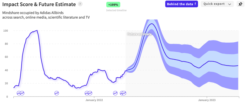 Taking after its name, the ADIZERO x ALLBIRDS 2.94 KG C02E has a carbon footprint of just 2.94 kg C02e and is manufactured using 63% less emissions than a comparable running shoe. This new release showcases a new approach to designing and manufacturing shoes and how sustainable projects can yield great innovations. The conversation surrounding Adidas and Allbirds has been growing, with the impact score increasing by 199% over the past year. The future estimate predicts continued rapid growth for the Adidas and Allbirds signal, illustrating that consumer sentiment may continue to rise throughout summer.