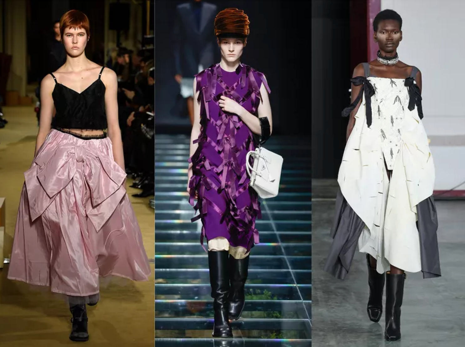 - Sheer, lace, fringe, leather, long skirts, bows, and tailored suits dominate the catwalks.