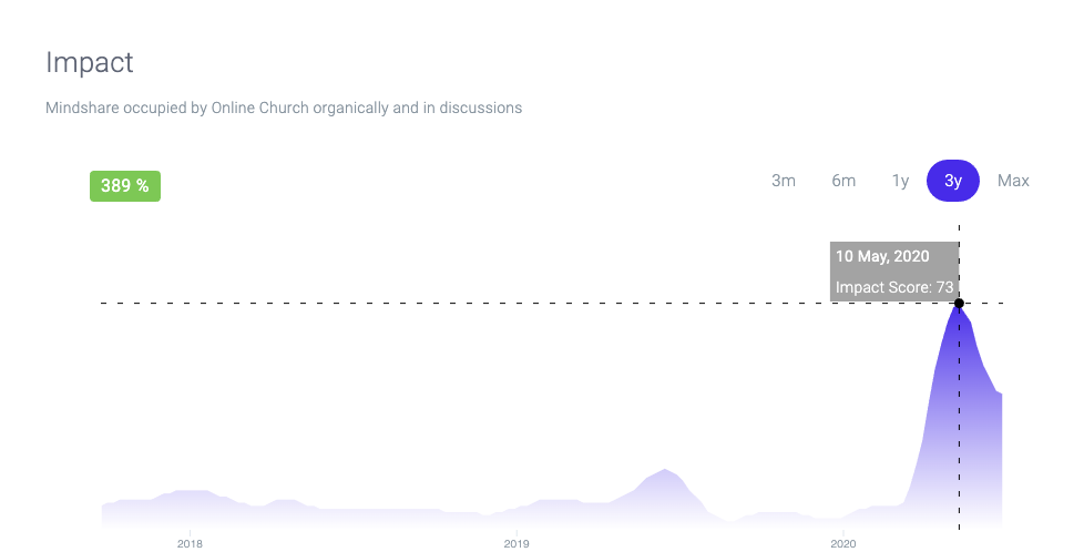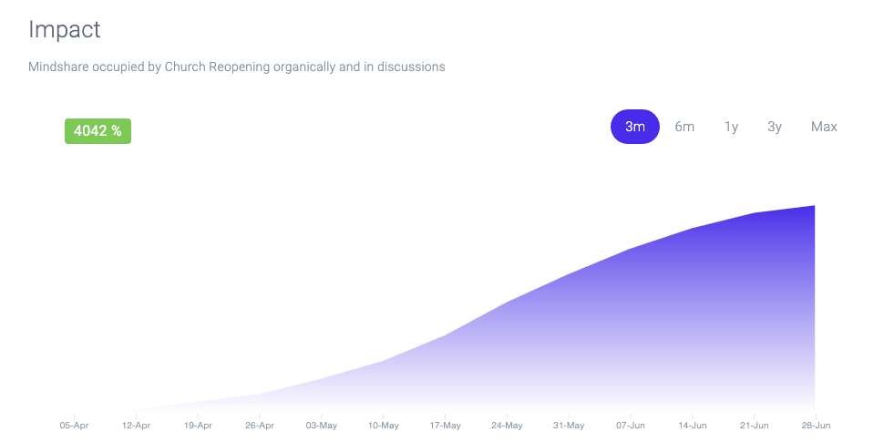 Digging deeper: But that doesn't mean Churchgoers aren't aching to get back to the real deal. Interest in Church re-opening is growing exponentially as well with a 3 month growth change of 4042% in its Impact Score - a market-tested metric that combines search interest, online media, and TV mentions.