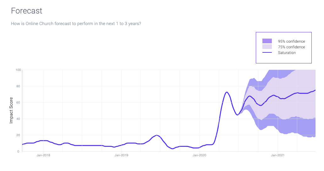 What the future holds: With the virus resurgence in several states, you can except the "Online Church" signal to continue reaching new heights. NWO.AI's forecast maintains very positive outlook for this trend [Premium Feature].