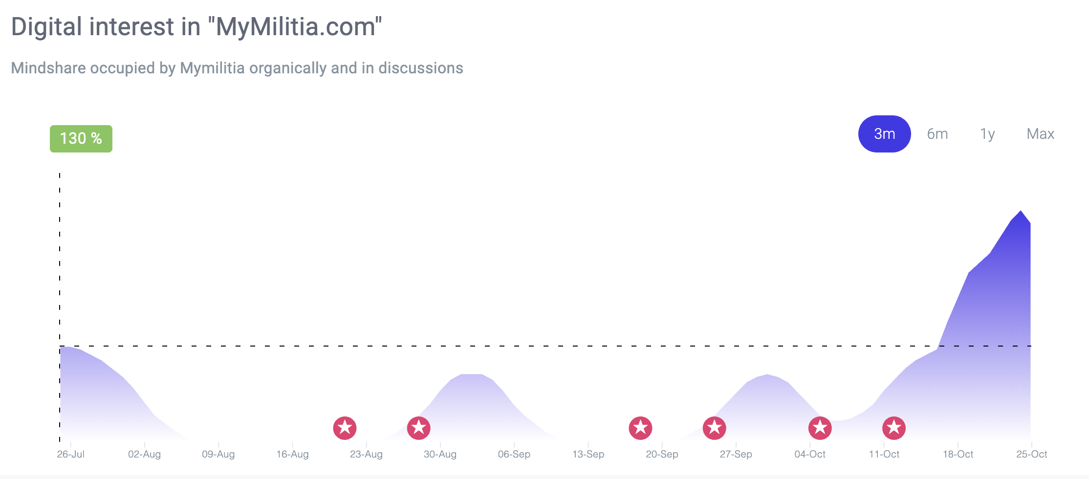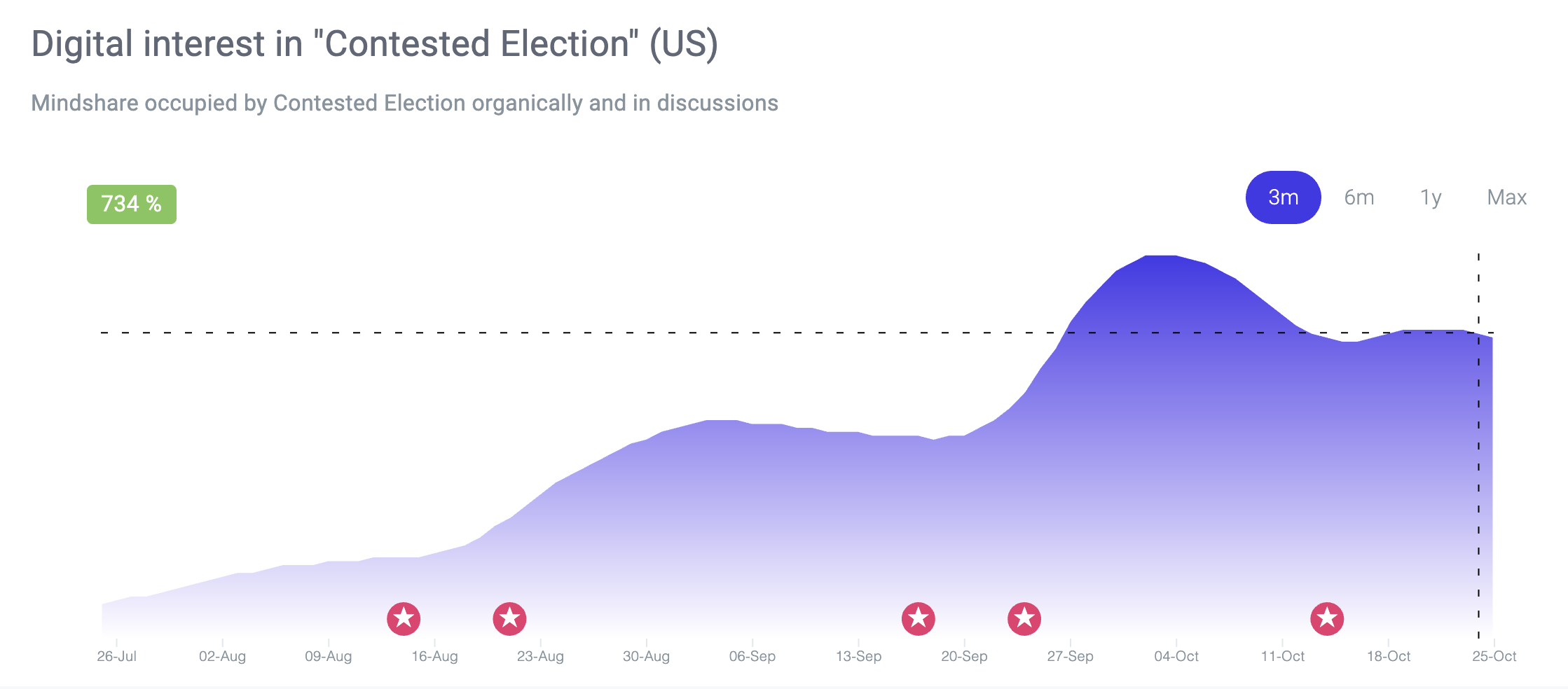 Fuel to the fire: NWO's predictive signals capture the mindshare occupied by topics across search engines, online media as well as TV stations and can offer unprecedented early-stage insight on the ebbs and flows of various themes in culture. NWO's platform notified clients of several inflection points in the signals for "contested election" and "electoral violence", both of which have experienced exponential growth in the past 3 months alone (734% and 112% respectively).