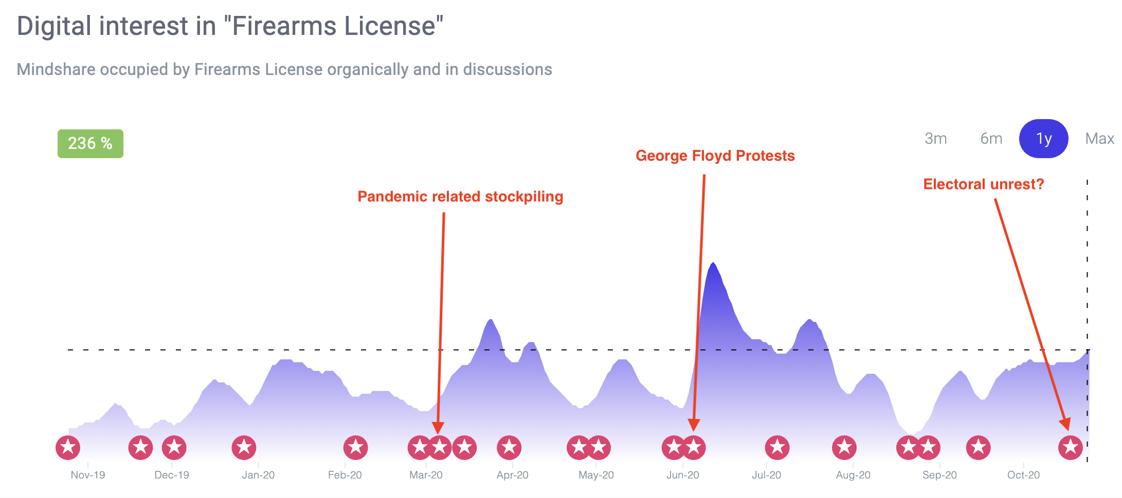 First-time buyers vs repeat buyers: NWO's signals are hinting of an uptick with some first-time gun buyers fearing an unraveling of the social order and some gun owners worried that the government might use its emergency powers to restrict gun purchases. The signal for "firearms license" effectively captures interest from first-time buyers. The signal recently reached an inflection point and is quickly approaching a saturation level it once hit during the pandemic stockpiling back in March and also the George Floyd protests in June.