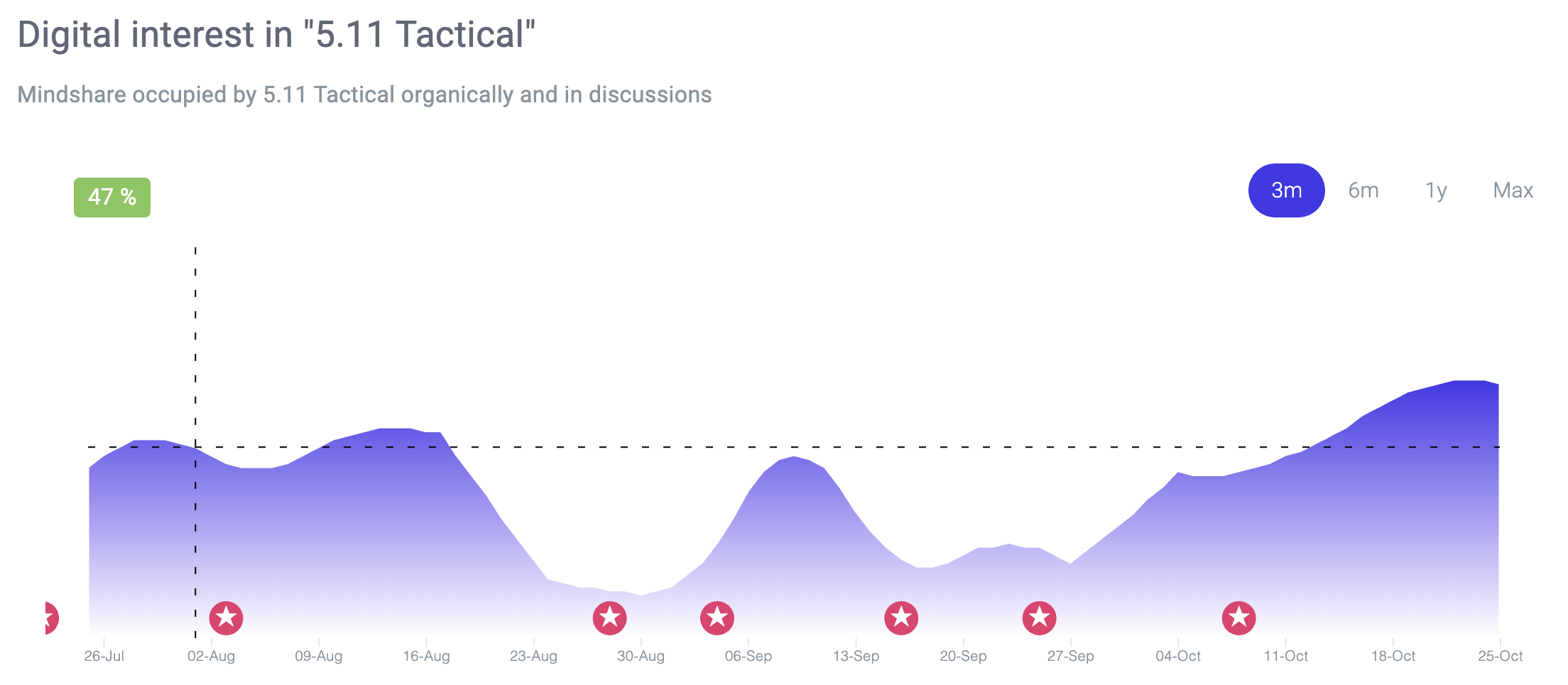 Retail chains such as 5.11 Tactical are leveraging the preparedness mindset and turning it into a national brand, has had its signal grow by 47% over 3 months with multiple inflection points - a sign that various factions are indeed preparing for a war-like scenario. Interestingly, President Donald Trump's adult sons are linked to the brand.