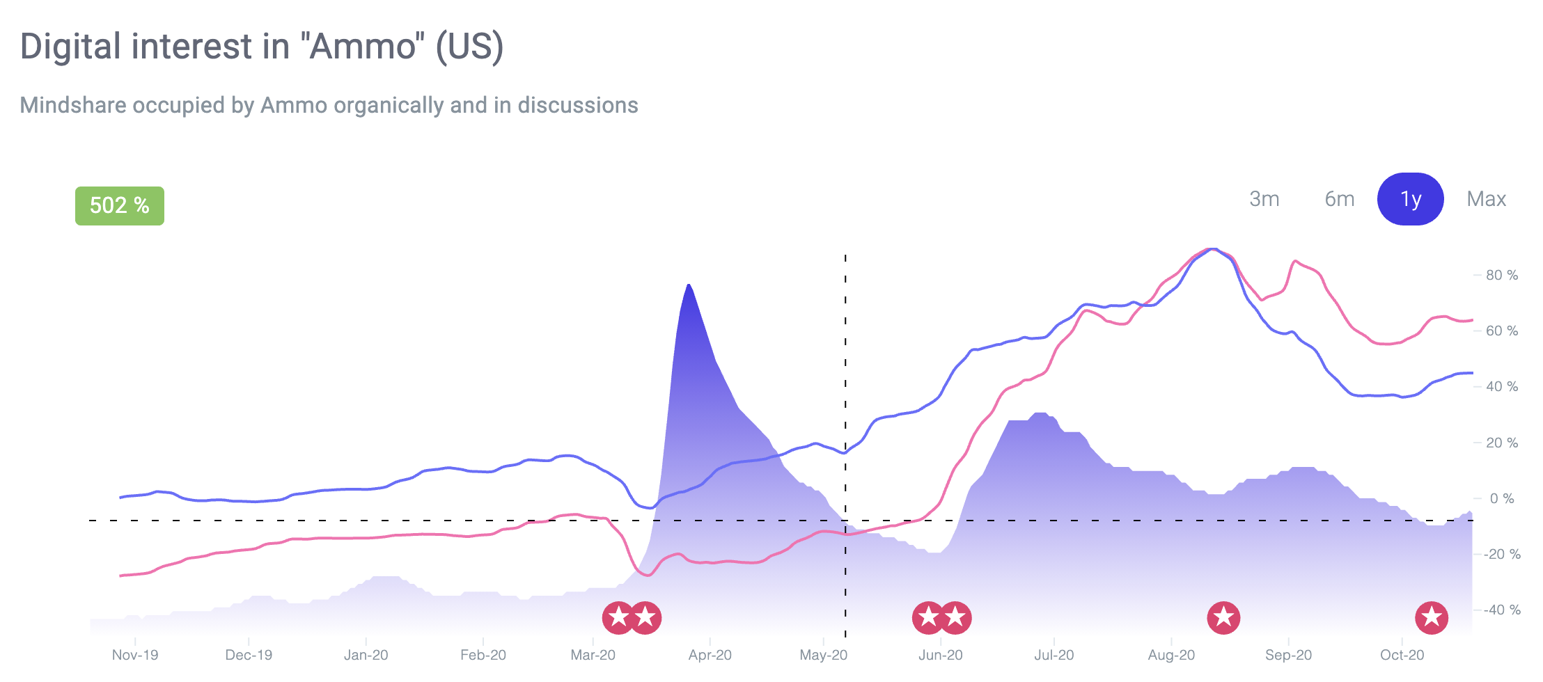 Interest in the purchase of ammunition followed a similar trend line, indicating strong interest from gun owners. The pink and blue curves overlaid on top of the signal denote relative change in stock price of Smith & Wesson ($SWBI) and Sturm Ruger ($RGR) respectively and have shown to have a strong correlation to the signal.