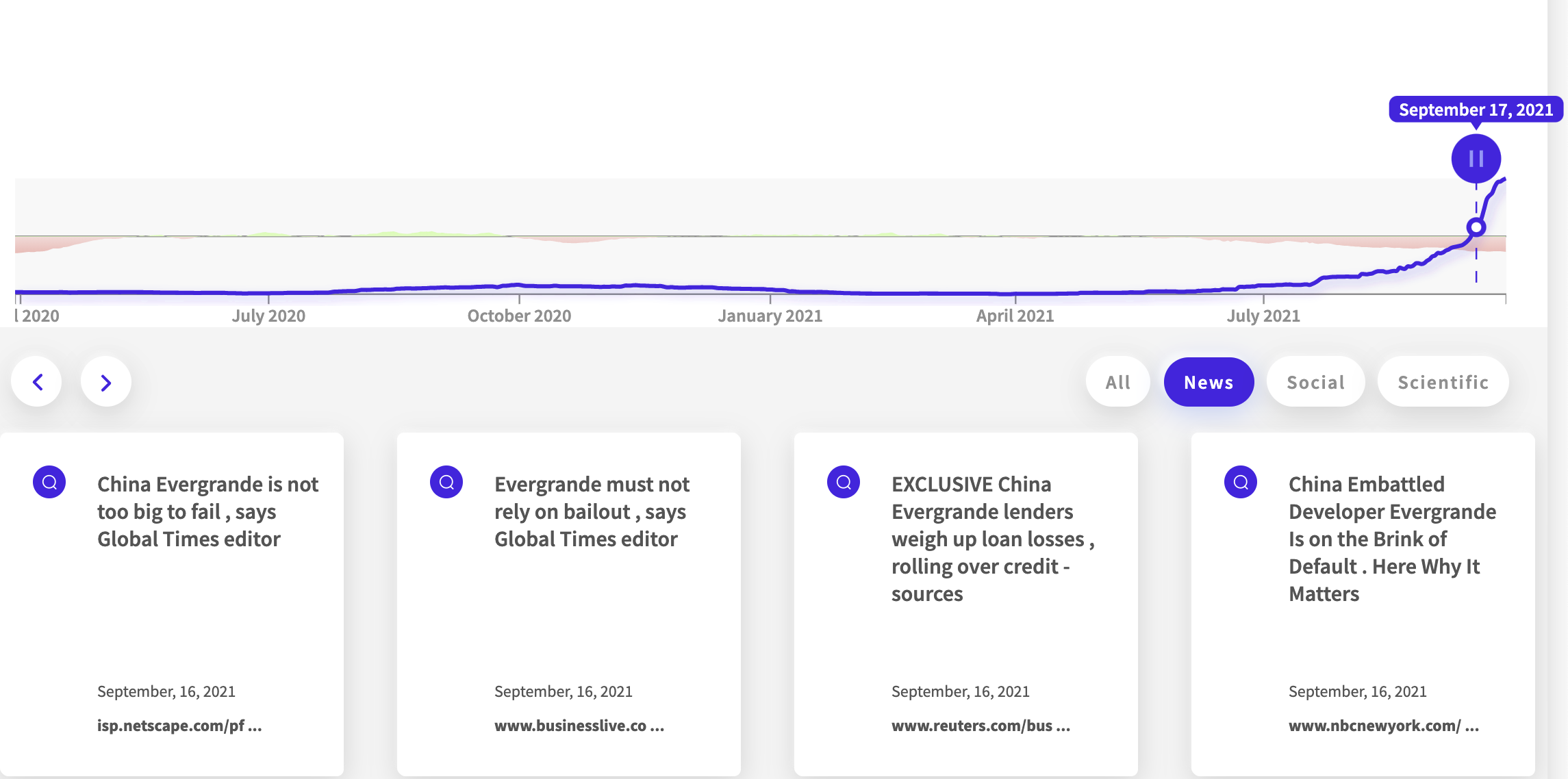 By the end of August, we saw even more social media chatter around Evergrande’s financial woes. There were indications that a default was imminent, with rumors floating around that Evergrande would not repay its debt.
