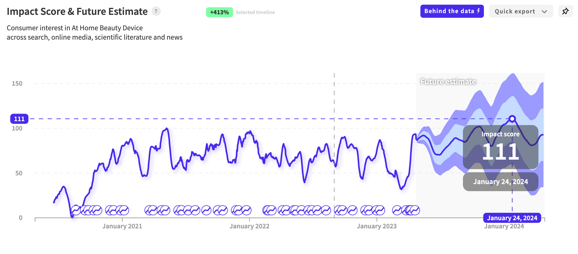 The below signal shows that ‘At-home Beauty Devices’ forecast significant consumer interest growth within the following year.