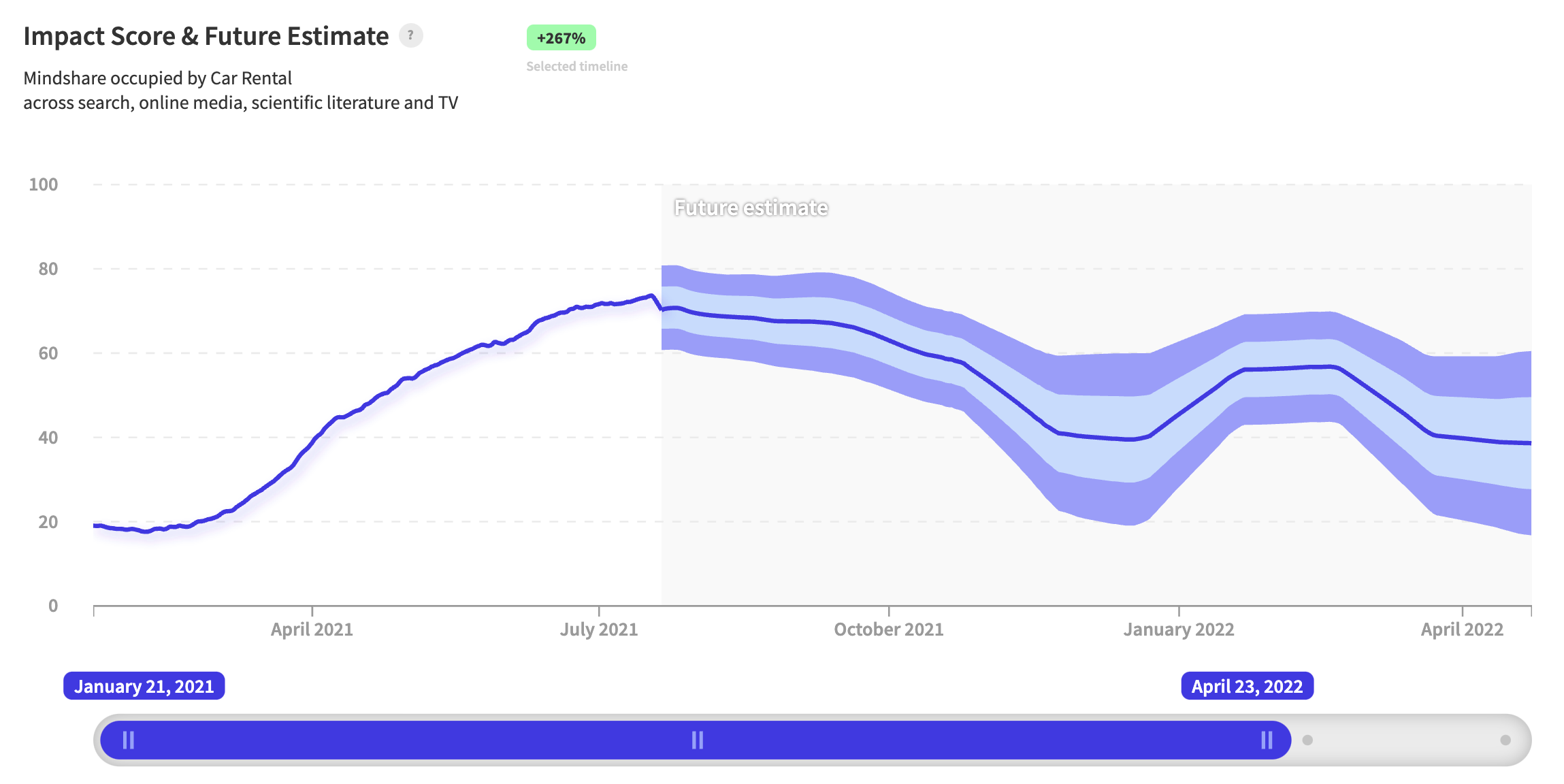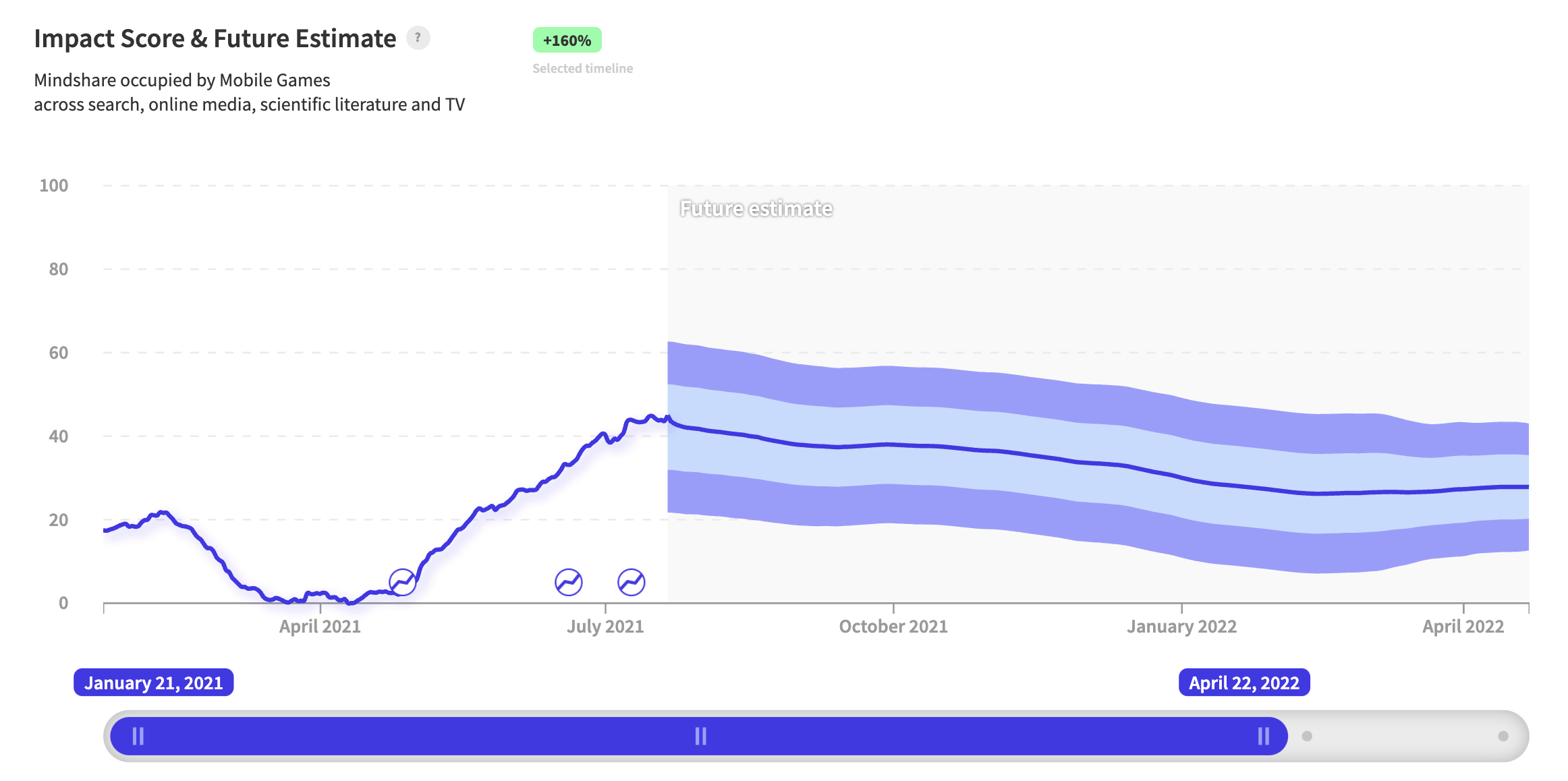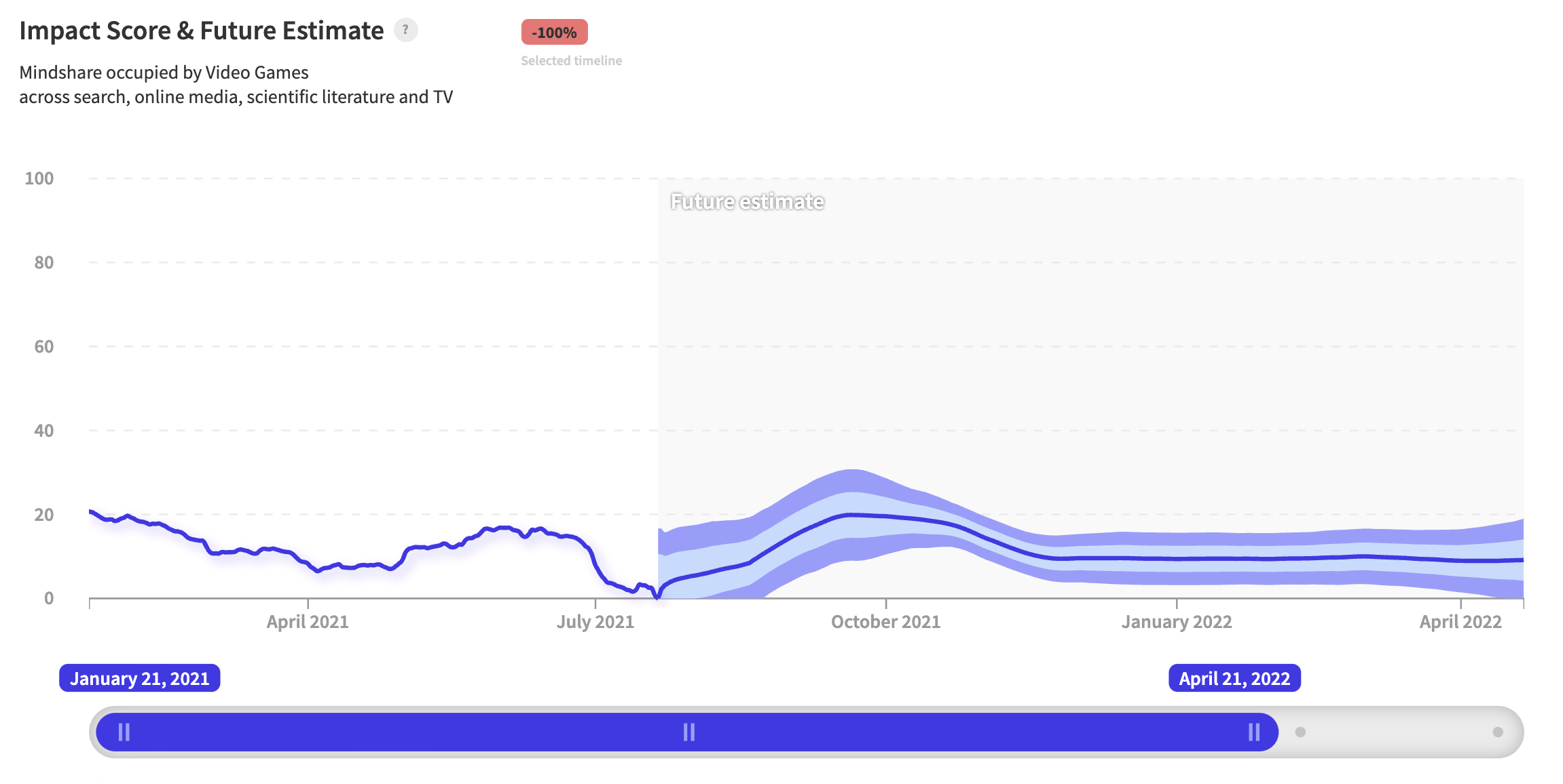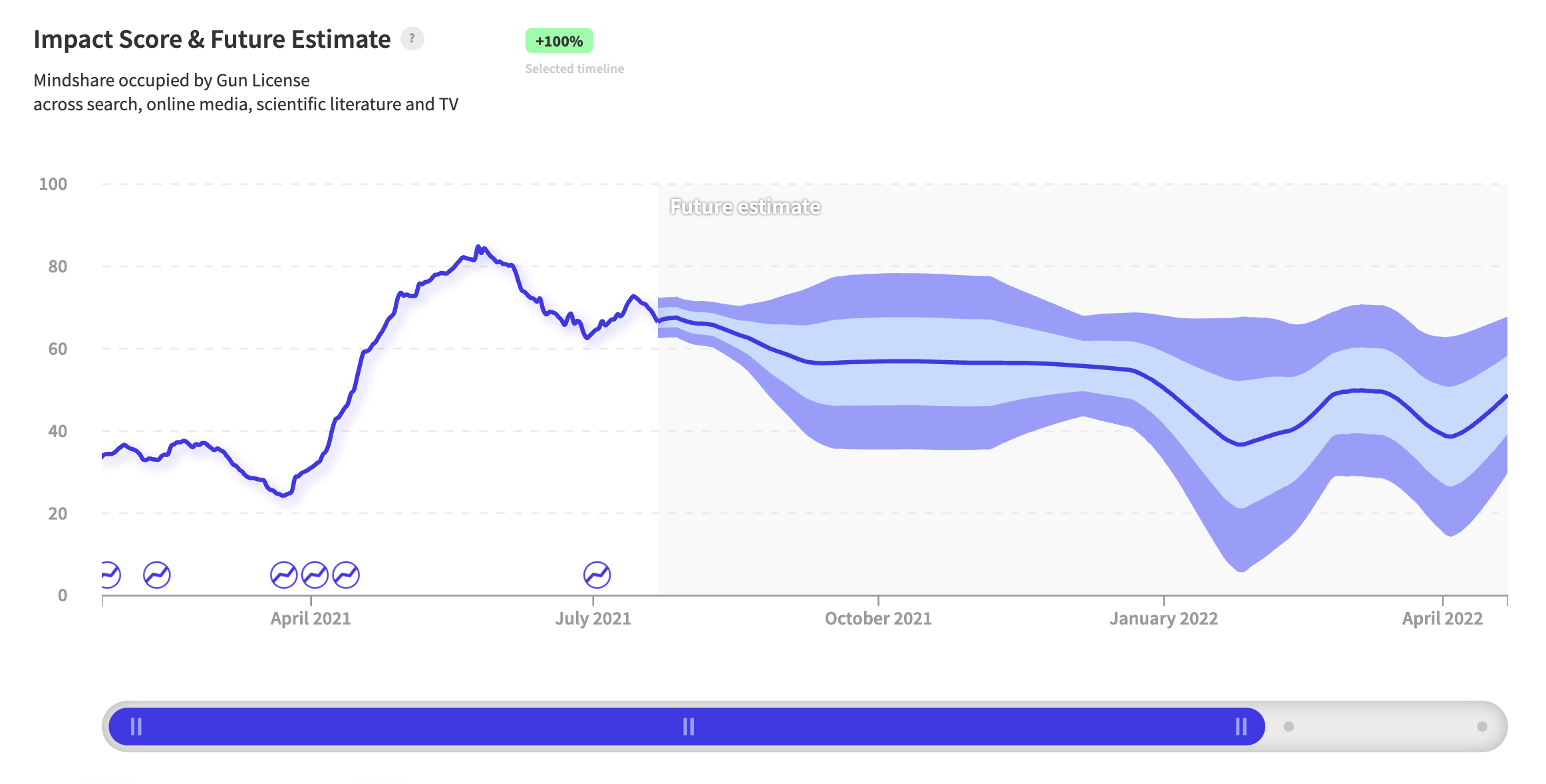 Last year, nwo.ai accurately predicted a massive spike in interest in firearms using its signal for "gun license", leading up to the US presidential election and the Capitol riots. 6 months later, the signal once again hit several inflection points ( April 2021) and rose sharply thereafter. A recent analysis of data from the Washington Post shows the average number of gun deaths per day is 14 people higher than it was in the last six months of 2020. The 1-year forecast indicates sustained interest and continuation of the trend.