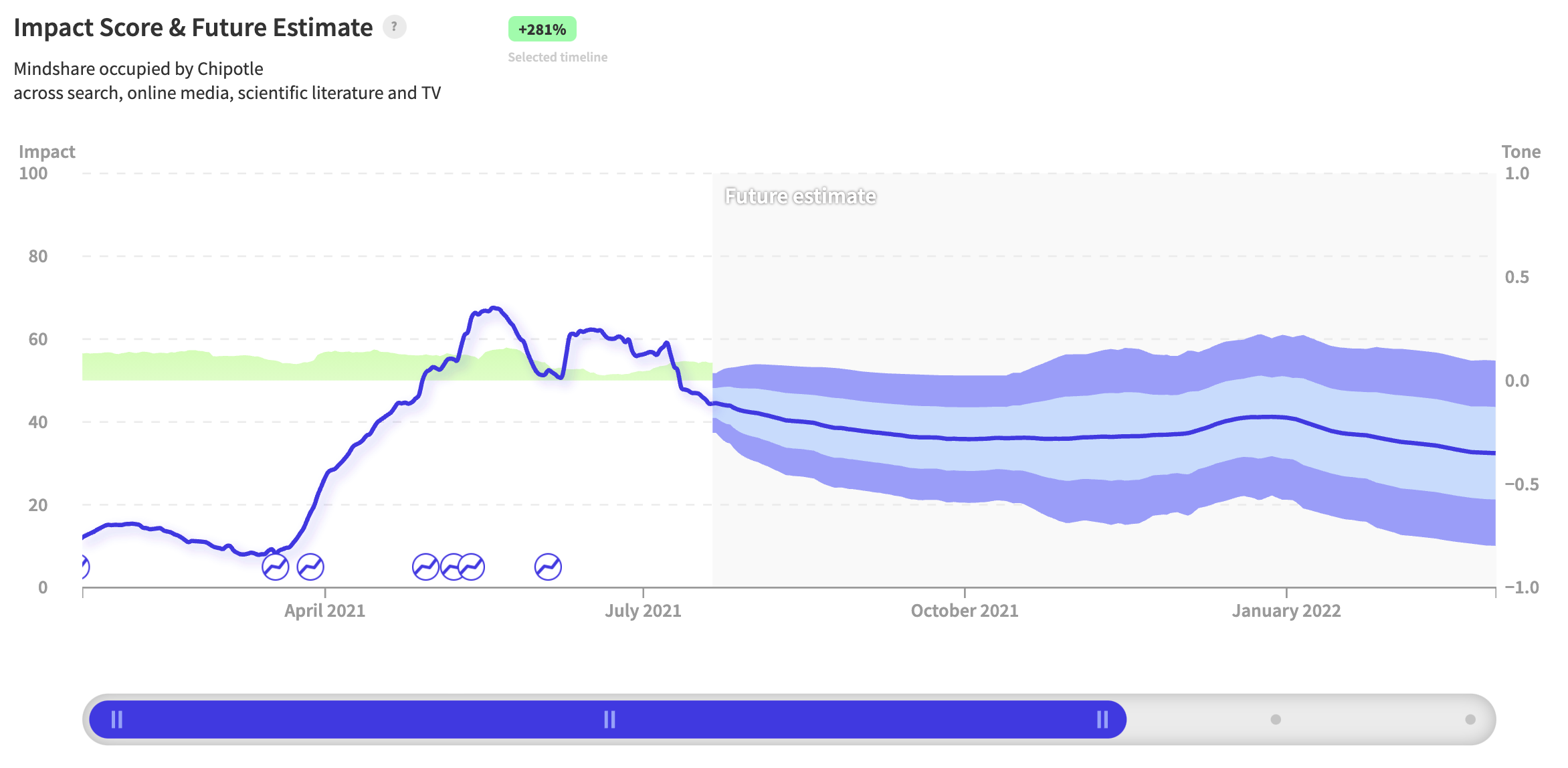After taking a dip to lows in January 2021, nwo.ai's signal for Chipotle foretold multiple inflection points in April 2021, indicating an exponentially growing interest in the brand and its products. Not surprisingly, Chipotle recently beat quarter estimates on the top and bottom line. Revenue grew over 30%, and just about every financial metric was positive for Chipotle. Their strong brand loyalty, as well as growth in digital ordering, have the potential for investors to benefit from strong, consistent execution. Since our inflection point prediction, $CMG rose 21%.