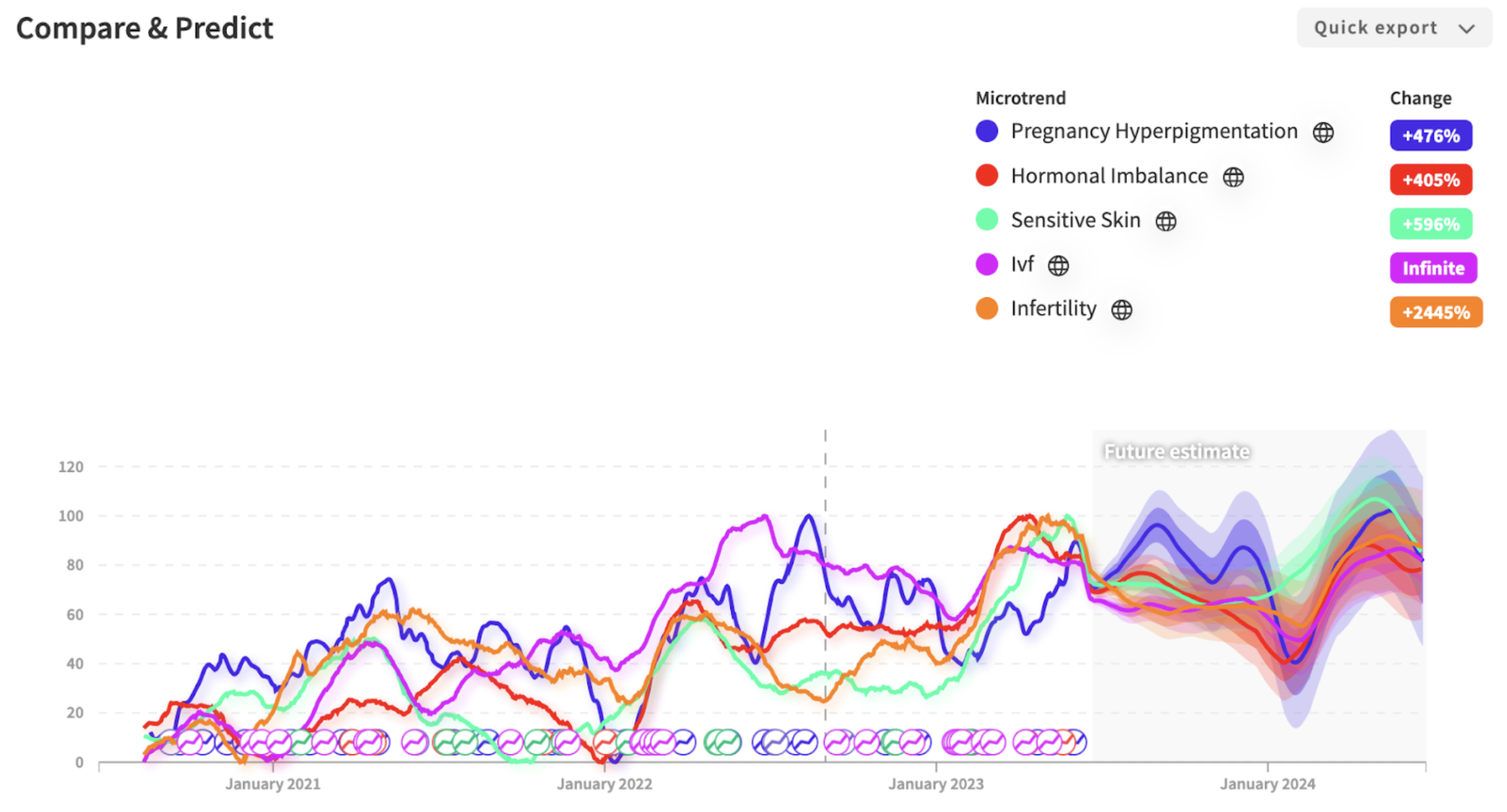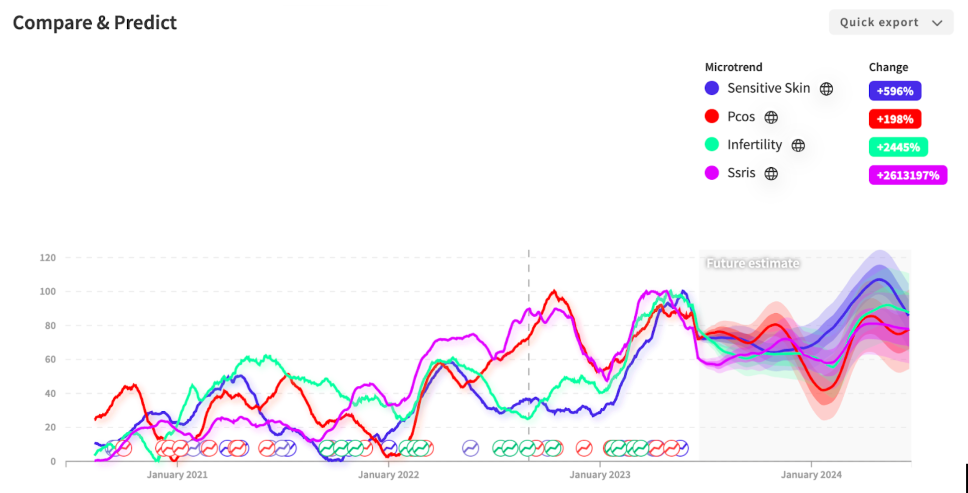 We used NWO.ai's microtrends feature to identify parallel consumer conversations. The top ranking with 'skin health' were sensitive skin, infertility, and anti-depressants.