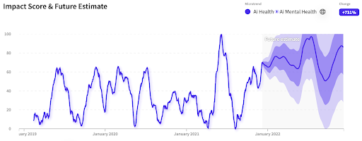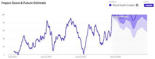 One of the limitations to on-demand therapy is that human counselors may not always be available. However, recent developments with AI chatbots offer another avenue for people who may even want completely anonymized mental healthcare. These chatbots are still relatively new to the therapy world, so it is yet to be determined how the quality of care may differ and what the potential drawbacks may be. In the last couple of years, NWO.ai’s platform has picked up a +1022% increase in Impact Score for “mental health chatbot,” and the Impact Score is projected to remain high. Chatbots won’t be replacing in-person therapy anytime soon, but for those with limited access to mental health help or seeking a more convenient approach, AI solutions offer a lifeline, literally.