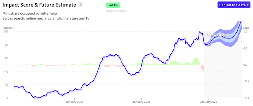 With the myriad of pandemic-related stressors in 2020, many people experienced an increase in their average screen time, while also continuing to struggle with mental health. The rise of mental health apps such as BetterHelp sought to address this problem by using a modality that was already comfortable for many users. Through mobile apps, accessibility to therapists is quick, easy, and often affordable. Over the past few years, NWO.ai’s platform has noted a +461% boost in Impact Score for “BetterHelp.” However, it is worth noting that the tone associated with BetterHelp has dropped significantly in the last month. After his fatal AstroWorld concert, Travis Scott partnered with BetterHelp to offer a free month to attendees, which resulted in mixed responses from the public. As of now, it is hard to tell if this could result in a potential negative backlash against the platform itself or if it only serves to drive the conversation about accessible mental health treatments.