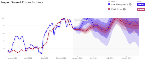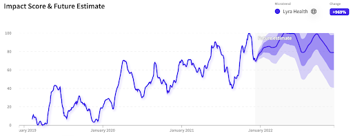 Not only does Lyra Health continue the trend of easier mental health access as mentioned above, but it also claims to offer more personalized healthcare benefits. While their focus is employee mental health, they use data-driven approaches to match customers to the best possible care solution. In the past few years, the Impact Score for “Lyra Health” has grown +969%, and is predicted to remain high. Lyra Health claims to help employers as well, increasing efficiency and decreasing the overall cost with more effective, personalized solutions for employees instead of broad-sweeping policies.