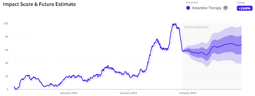 Recent revelations on the effectiveness of ketamine have made the controversial drug a major talking point in the healthcare industry, and our platform noted a +1345% growth in Impact Score over the past few years for “ketamine therapy.” Since ketamine is already an FDA-approved drug, often used as an anesthetic during surgeries, it may be more readily adopted. Though there are concerns about drug abuse, it can be a powerful antidepressant when used in conjunction with psychotherapy treatment. Since this is such a niche field, it’s a perfect opportunity for startups like Nue Life Health that aim to make this treatment more accessible and affordable through telehealth.