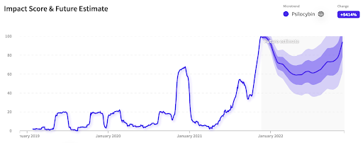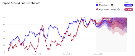 Another term that has become commonplace: microdosing. This refers to the practice of consistently taking very small amounts of a psychoactive drug, like psilocybin, in order to improve mental health. While many proponents of the practice claim to have benefited from its effects, others believe that more research is needed to rule out placebo effects. Our platform has noted a +2457% increase in Impact Score for “microdosing” over the past few years, alongside a +2183% boost in “psychedelic therapy.” NWO.ai’s platform predicts that interest in the topic will likely continue to be a part of global mindshare.