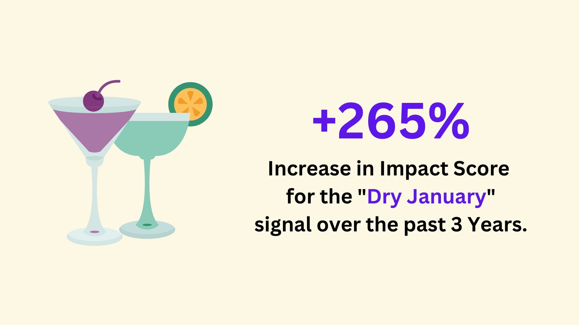 The last time we covered Mocktails was, in part, due to the rising consumer interest in Sober October 2021. As we ring in the New Year, a different sober living trend has emerged, generating consumer interest. The impact score for Dry January has increased by 425% over the past six months. Dry January is staying sober during the month of January and many people partake to start the year off right. These sober-curious trends may indicate consumers are shifting away from alcoholic beverages and opting for a non-alcoholic alternative. According to Nielsen, non-alcoholic drink sales increased by nearly 21% from 2021-2022. Based on this data, there may be an intriguing opportunity for non-alcoholic and mocktail-type drinks.