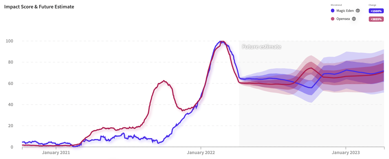 Not all are happy with the new integration; Magic Eden, another NFT exchange, is currently the dominant marketplace for Solana. So we may see users on Magic Eden shift over to OpenSea. However, the signals for both "Magic Eden" and "Open Sea" are relatively similar. The future estimate shows that both platforms will continue to perform in the coming year