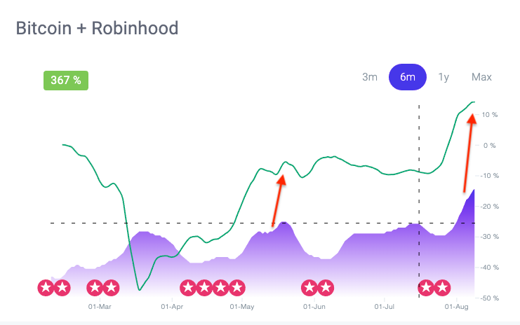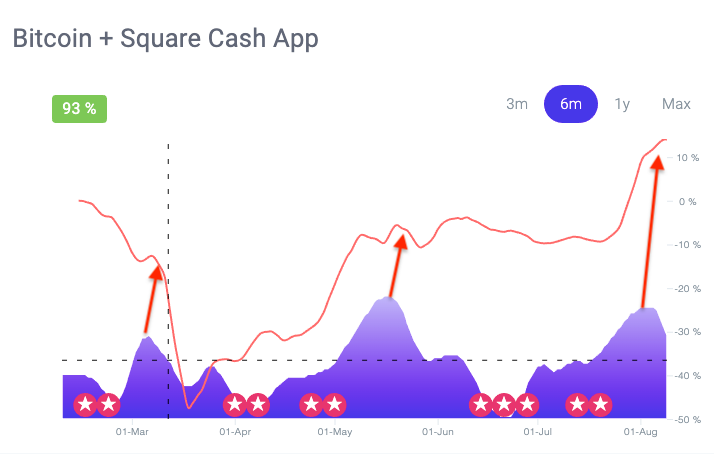 Thanks to Robinhood and Square Cash, access to Bitcoin has improved dramatically. A quick search on NWO reveals that growing interest in both apps (shaded area) correlates to a jump in the price of Bitcoin (red curve) – the correlations are just uncanny.