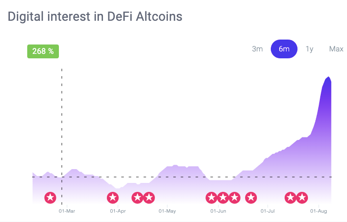 4. Altcoins are underscoring the bitcoin narrative: Most smaller alternative coins or “altcoins” in decentralized finance (DeFi) trade against Bitcoin, not the U.S. dollar. The signal for DeFi and its association with Bitcoin reached several inflection points in July. Shortly after NWO surfaced these inflection points, DeFi’s market value approached $5B. This means that if traders want to realize the unrealized profits they made on altcoins on DeFi, they will need to acquire Bitcoin, thus further pumping the price of Bitcoin.