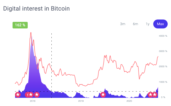 The signal for Bitcoin on NWO peaked in late 2017, implying that the mindshare occupied by Bitcoin reached an all-time high at the time (Impact Score:97/100). At the same time, the price of Bitcoin reached $20k before eventually crashing. Compared to 2017, the signal right now is still very tame (Impact Score: 17/100) while the price has already risen to $12k. Even if Bitcoin's signal were to only return to the mindshare it once occupied in 2017, the potential for Bitcoin price to grow is enormous!