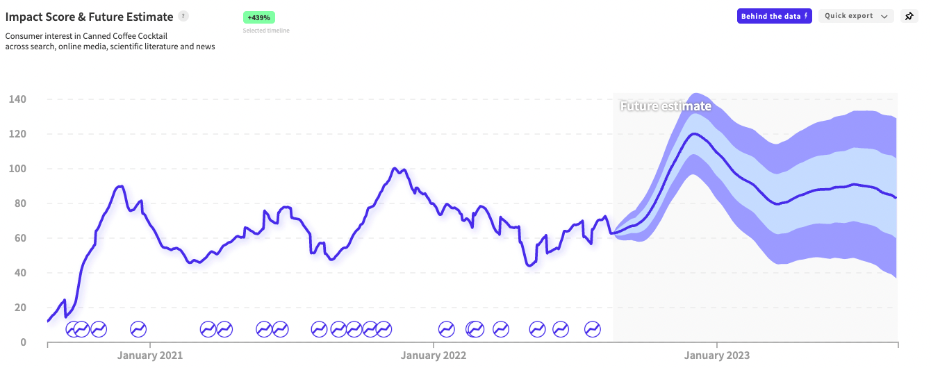 While cocktails are great on their own, if you want to step it up a notch, coffee may be the addition you need. Coffee cocktails have seen an explosion in popularity, seemingly out of nowhere. Over the past two years, the impact score for “Coffee Cocktails” has increased by 557%. The future estimate predicts substantial growth in the coming months, peaking during the holidays.