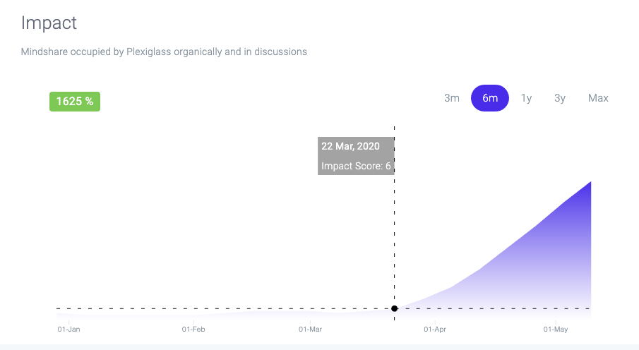 The graph represents the "Impact Score", which is a metric that combines the mentions of Plexiglass in social media, news articles, TV as well as interest captured via search engines into one unified metric. At any given point in time, the Impact Score is your go-to score in order to gain an understanding of the mindshare occupied by any microtrend. Full historical Impact Score and Sentiment for Plexiglass is available here: https://nwo.ai/signal/discover/plexiglass#