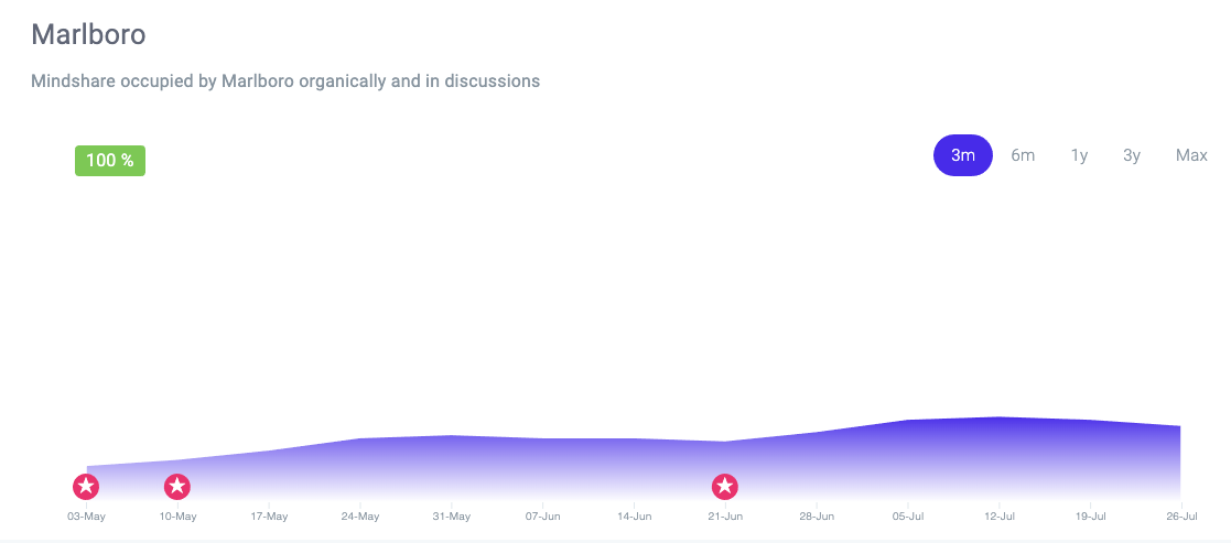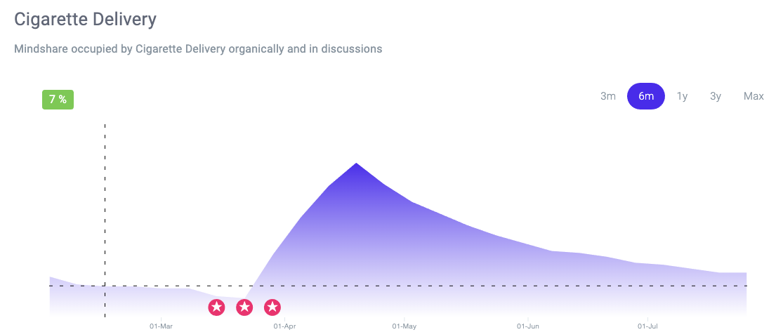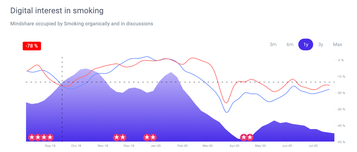 A shocking reversal: Over the past month, we have shared 3 trends that were declining but have been provided with a second lease on life, thanks to the coronavirus pandemic. A quick search on NWO.AI for signals related to interest in cigarette brands reveals a drop until May 2020 followed by a sharp rise. In short, people are smoking more during the pandemic. Take, for instance, the signal for Marlboro, a brand that accounts for 43% of all cigarettes sold in the US. Interest in Marlboro is up almost 100% in the last 3 months after hitting several inflection points in mid-May.