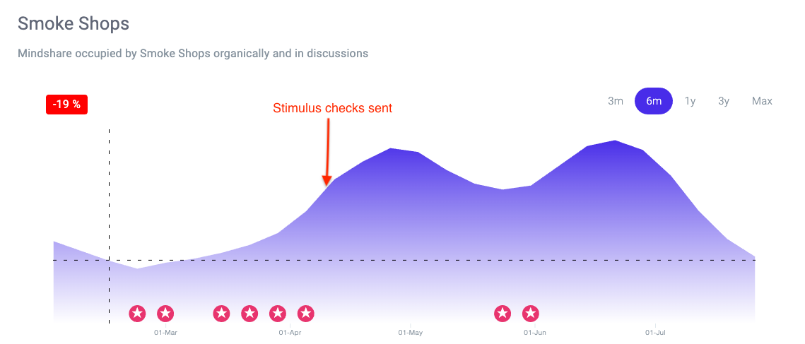 Why is this happening? The inflection point in the signal for “smoking” and “smoke shops" coincides with the arrival of the stimulus check. Our depressing inference is in line with a survey by Wallethub that concludes that some 24 million Americans have spent their money on either tobacco or alcohol.