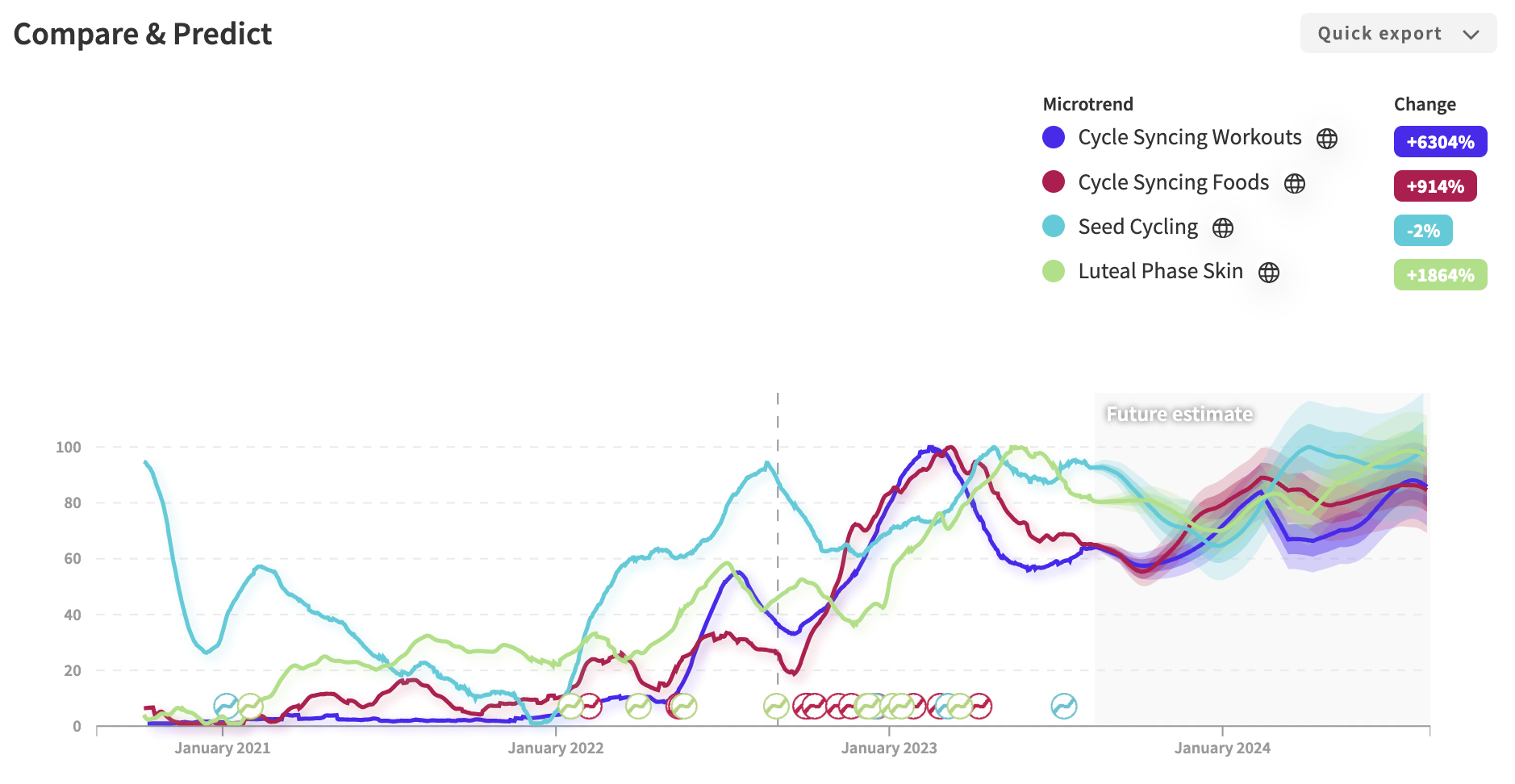 The NWO.ai signal comparison report forecasts continued consumer interest in cycle-syncing practices related to fitness, skin, and diet.