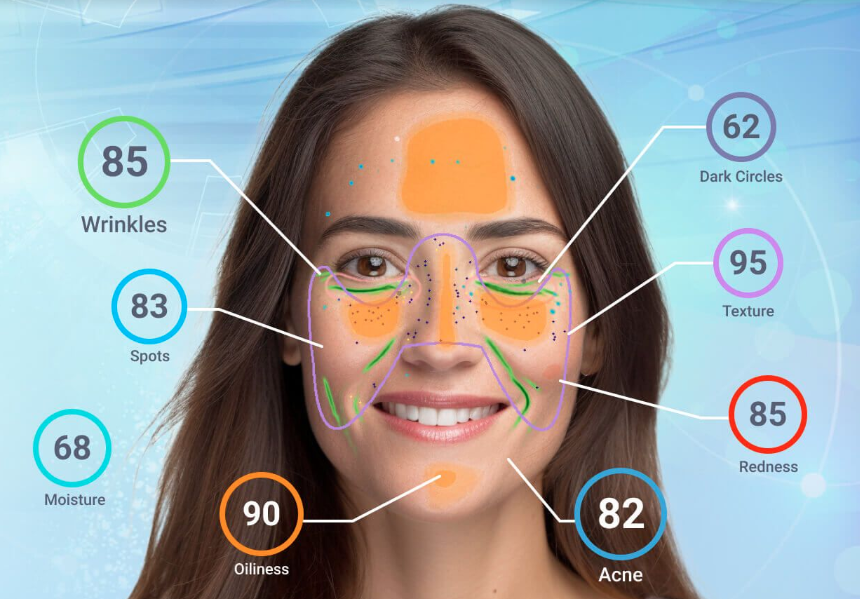 The Perfect, well-lit mirror and camera scanner produce a close-up 360-degree photo of your face. Within seconds you’re scored in multiple skin-related areas, such as wrinkles, dark circles, and acne.
