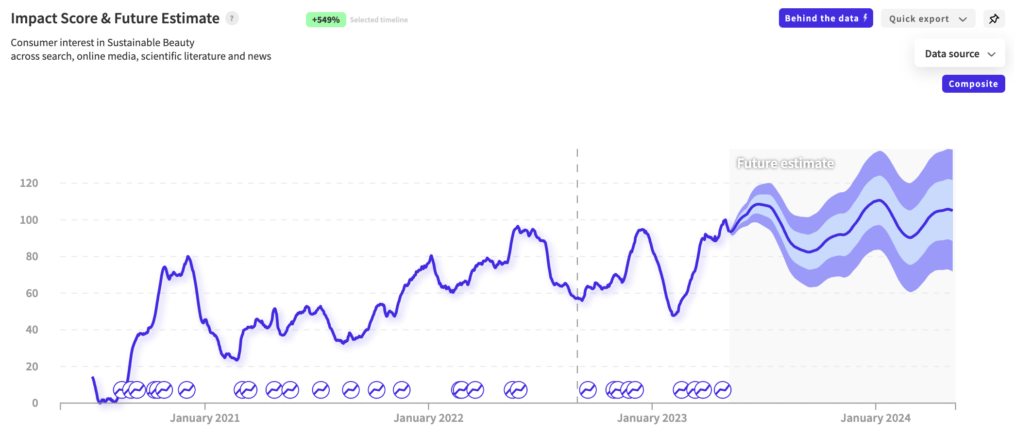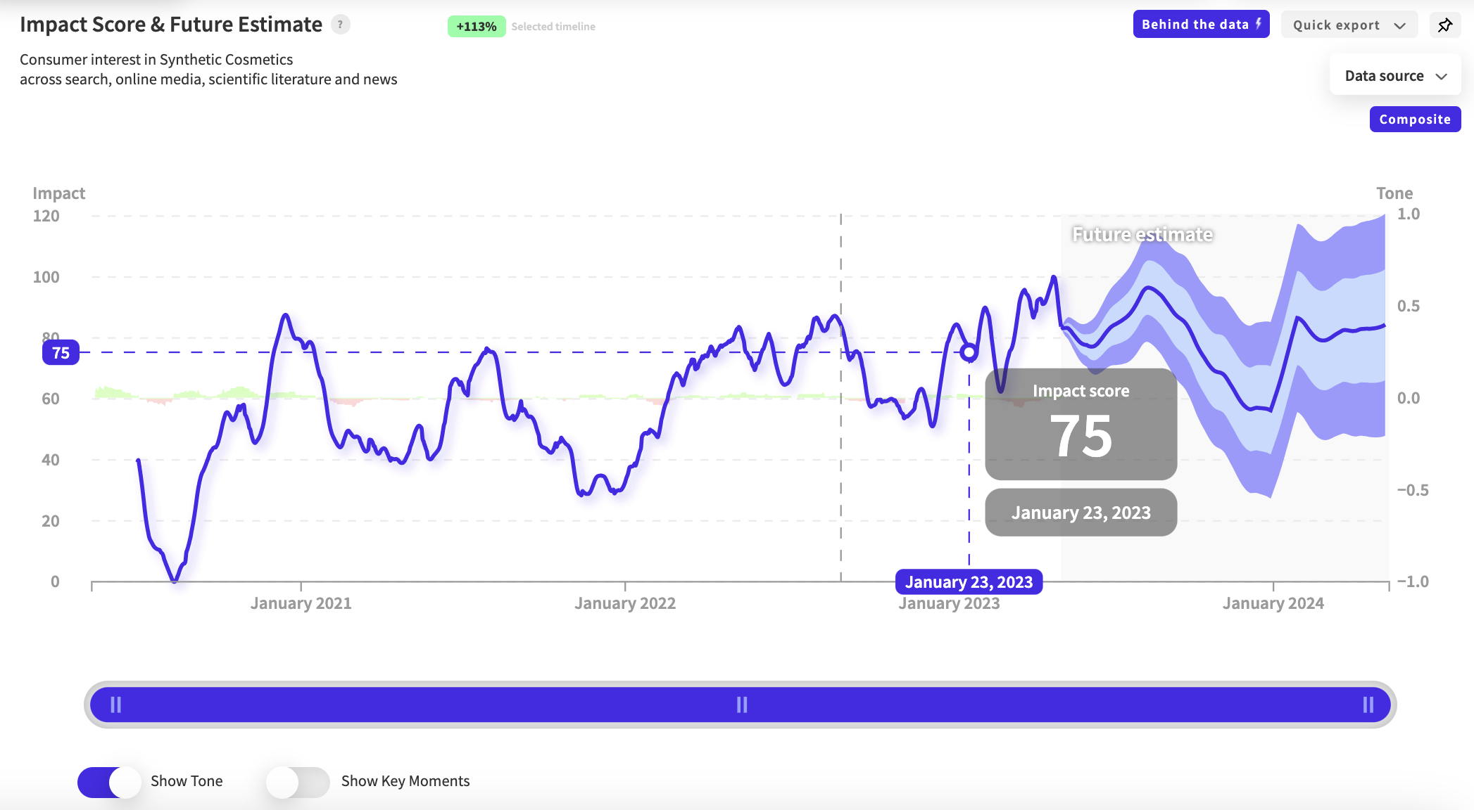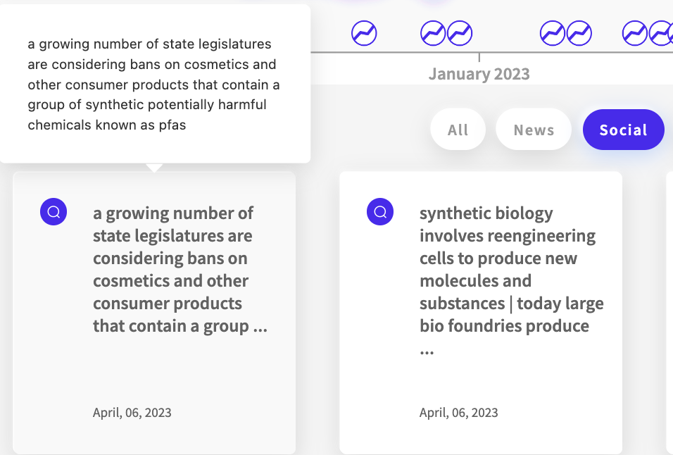 The above NWO.ai report displays the tone for the signal ‘synthetic cosmetics.’ The fluctuation between green and red means that the consumer sentiment around the topic is mixed.