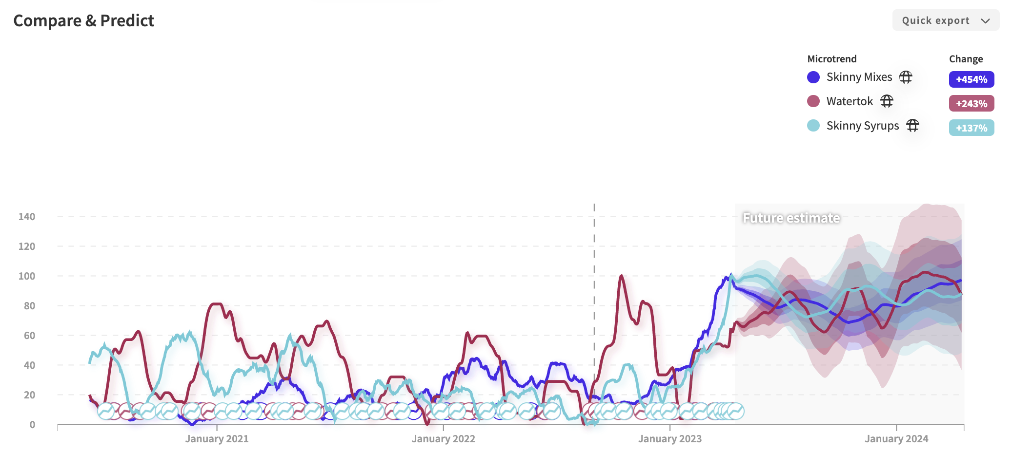 The below comparison shows the sudden rise in popularity of the Skinny Mixes brand with the virality of the ‘WaterTok’ trend.