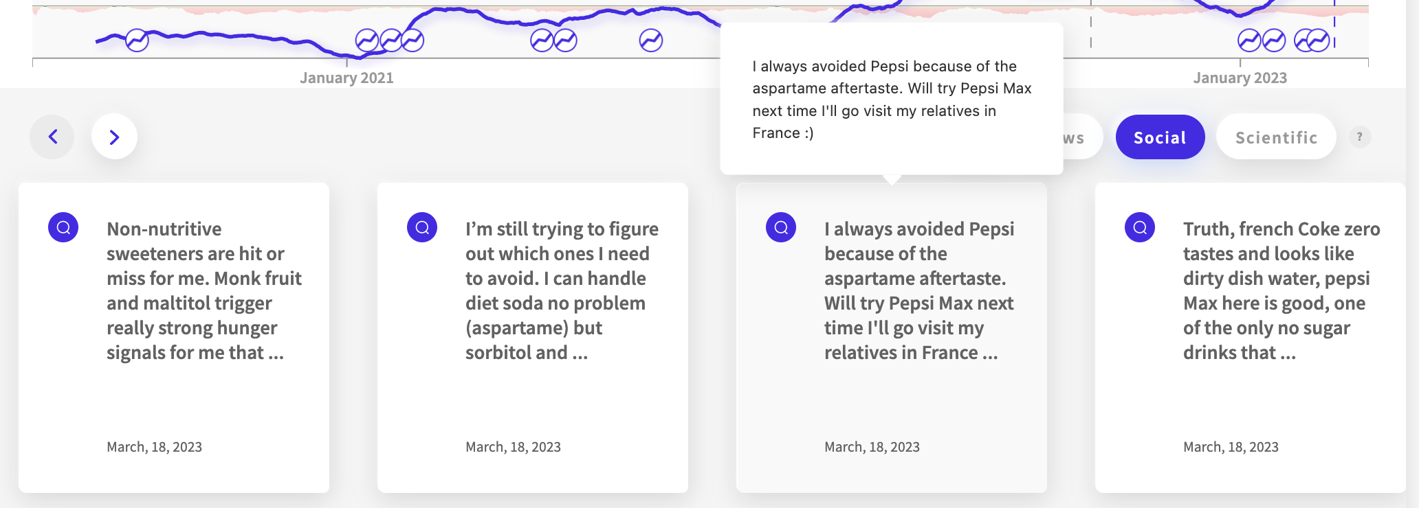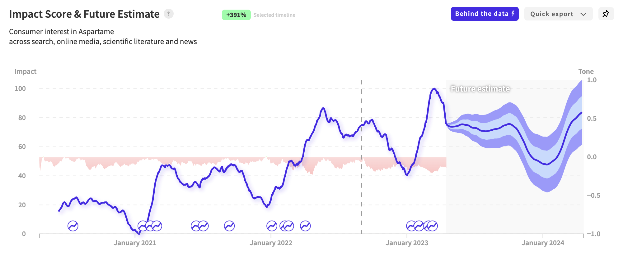 While the signal for Aspartame has increased over the past three years, with an impact score of +391%, the rise in conversation is not for good reason. Using the NWO.ai tone analysis, we can see that the consumer sentiment is entirely negative.