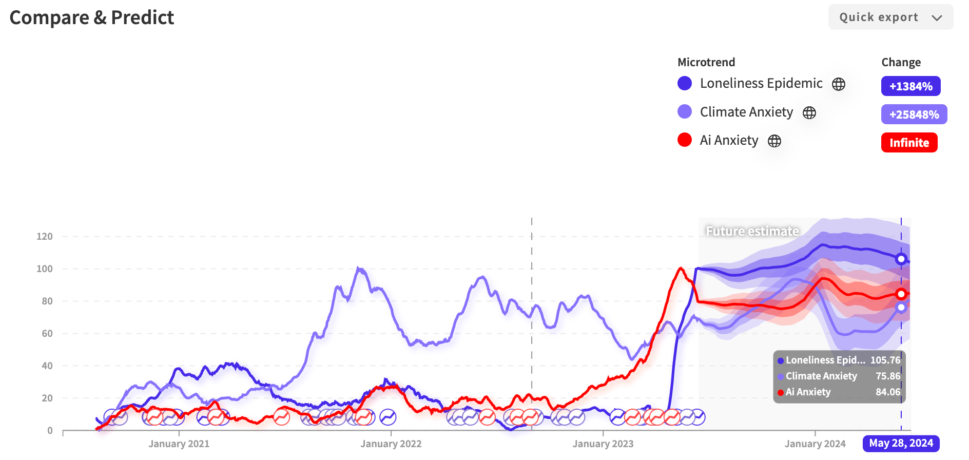The below signal shows the sharp increase in consumer conversations around loneliness, climate anxiety, and AI worry.