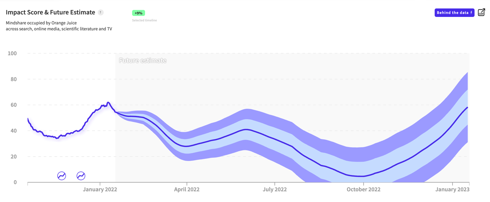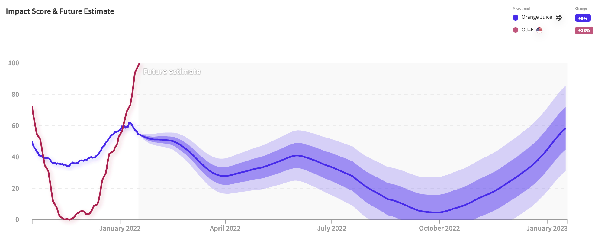 Feeling like your morning glass of OJ is a little pricier these days? Orange prices have spiked 50% since the beginning of the pandemic, and not just because lockdown has people returning to sugary, comforting favorites - it’s primarily down to a critical shortage of oranges in the Western Hemisphere. Florida especially is still feeling the effects of Hurricane Irma, manifesting through the highly pervasive and deadly citrus greening disease, limiting this year’s orange crop to its lowest level since 1945. Our AI picked up an inflection point for "Orange Juice" in early December when conversation picked up about the Orange Juice Shortage.