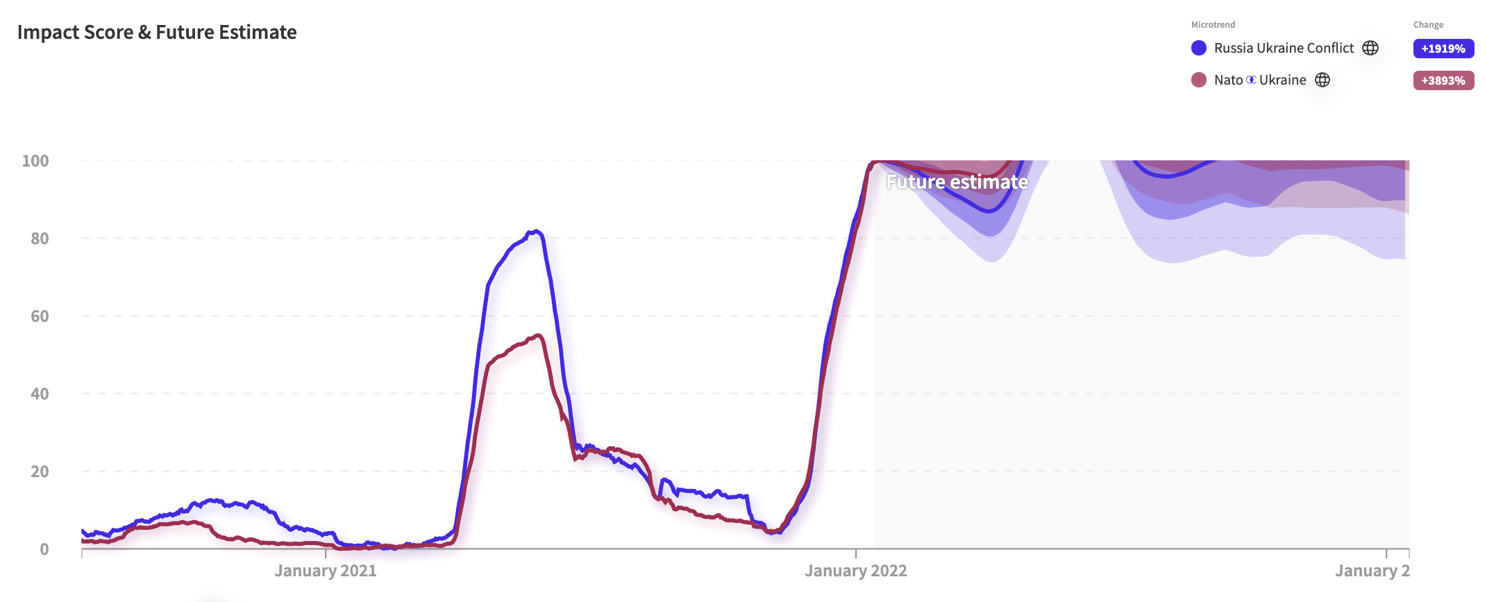 Over the past two months, the impact score for "Russia Ukraine Conflict" has exploded, peaking at a score of 100 and projected to continue to rise into next year. We wrote about the growing border tensions between Russia and Ukraine in December. Since then, tensions have continued to escalate, with Russia massing additional troops and artillery at the border. Moreover, talks between NATO and Russia broke down last week in Brussels and Geneva over Russia’s demand that NATO promise to halt any eastward expansion of the alliance, which NATO and the US firmly rejected. NWO.ai's impact score saw a direct correlation between the "Russia Ukraine Conflict" and NATO conversations relating to Ukraine in early November, both signals breaking out in tandem. According to newly released intelligence, Russia is preparing to create a pretext for an invasion by having undercover operatives in Ukraine conduct "false flag operations."